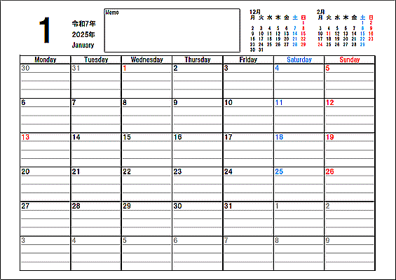 月曜始りと日曜始りの、4書式が無料でダウンロードできます。 |