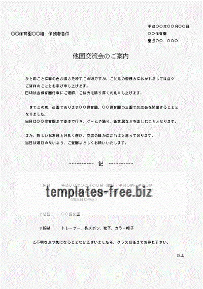 ○○保育園○○組 保護者各位 ○○保育園 園長○○ ○○○ 他園交流会のお知らせ 春はまだまだ浅く、風に冷たさが残る今日この頃ですが、ご父兄の皆様方におかれましては益々ご健勝のこととお喜び申し上げます。 日頃は当保育園行事にご理解、ご協力を賜り厚くお礼申し上げます。 さて、本年も恒例の○○保育園との交流会を行います。 新しいお友達と仲良く、色々なことに挑戦できるようにと思っております。 是非とも遅刻のないよう、ご登園よろしくお願いいたします。 ---------- 記 ---------- 1.日時 平成○○年○○月○○日(曜日)午前○時~午後○時 歩いて行きますので、午前○時○○分までに登園して下さい。 (雨天時は中止) 2.場所 ○○保育園 3.服装 トレーナー、長ズボン、靴下、カラー帽子 以上 Excelフォーマット無料ダウンロード