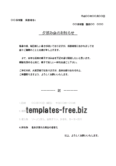○○保育園 保護者各位 ○○保育園 園長○○ ○○○ 夕涼み会のお知らせ 極暑の候、毎日厳しい暑さが続いておりますが、保護者様におかれましては益々ご健勝のこととお慶び申し上げます。 さて、本年も恒例の親子夕涼み会を下記の通り開催したいと思います。 親睦を深めると共に、親子で楽しい一時をお過ごし下さい。 ご多忙の折、大変恐縮ではありますが、是非お繰り合わせの上、ご来園賜りますよう、よろしくお願いいたします。 ---------- 記 ---------- 1.日時 ○○月○○日(曜日) 午後○○時〜○○時 2.場所 ○○保育園 園庭 3.催し物 ソーメン流し、金魚すくい、かき氷、ヨーヨー釣り 4.持ち物 着衣が濡れた場合の着替え 以上、よろしくお願いいたします。 Excelフォーマット無料ダウンロード